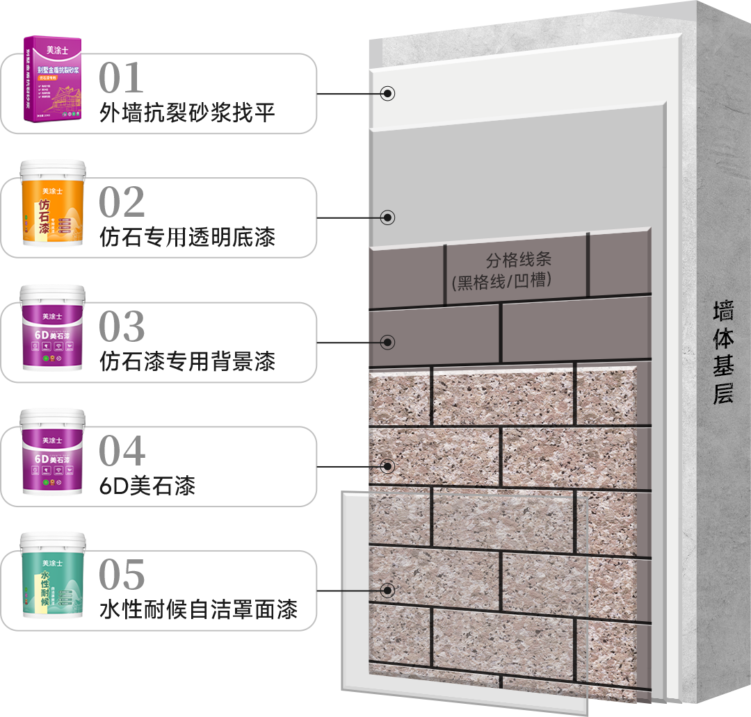 6D美石漆采用有機(jī)硅改性丙烯酸乳液及助劑等優(yōu)質(zhì)原料制作,產(chǎn)品具有色彩穩(wěn)定、耐候耐老化、耐污、硬度高、防開(kāi)裂、防水等特點(diǎn),是一種性能優(yōu)異的高品質(zhì)建筑物墻面裝飾材料,涂裝后呈現(xiàn)豐富的紋理與色彩,使建筑物具有花崗石的質(zhì)感及豪華典雅的裝飾效果。