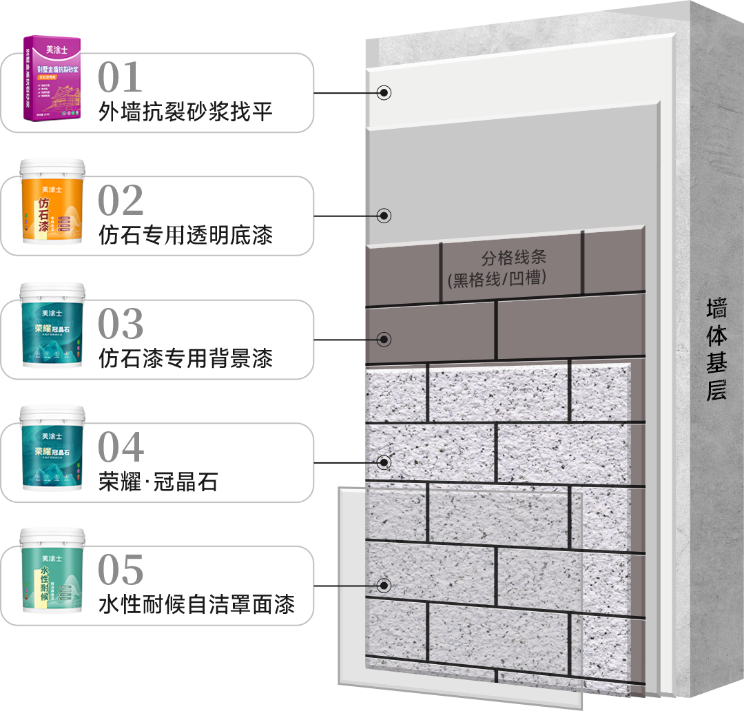 優(yōu)選具有高耐候、超耐污的硅丙乳液為主要成膜物質(zhì),精選顆粒圓潤、質(zhì)地堅硬的天然彩砂,搭配水性環(huán)保型功能助劑精制而成的水性含砂多彩涂料。該產(chǎn)品擁有自清潔、超耐候、高硬度及優(yōu)異的耐水白等優(yōu)點,對比普通水包砂多彩,其彩點晶瑩剔透,具有更高的仿石材效果,仿真度高達99以上。榮耀冠晶石是冠晶石體系的升級版,不僅可以得到類似荔枝面大理石材的花紋色彩等的裝飾風(fēng)格,同時對墻體有極好的保護和裝飾效果。