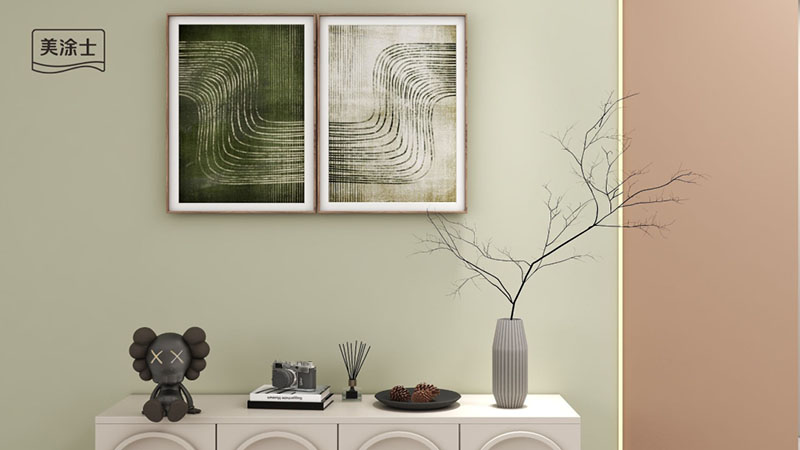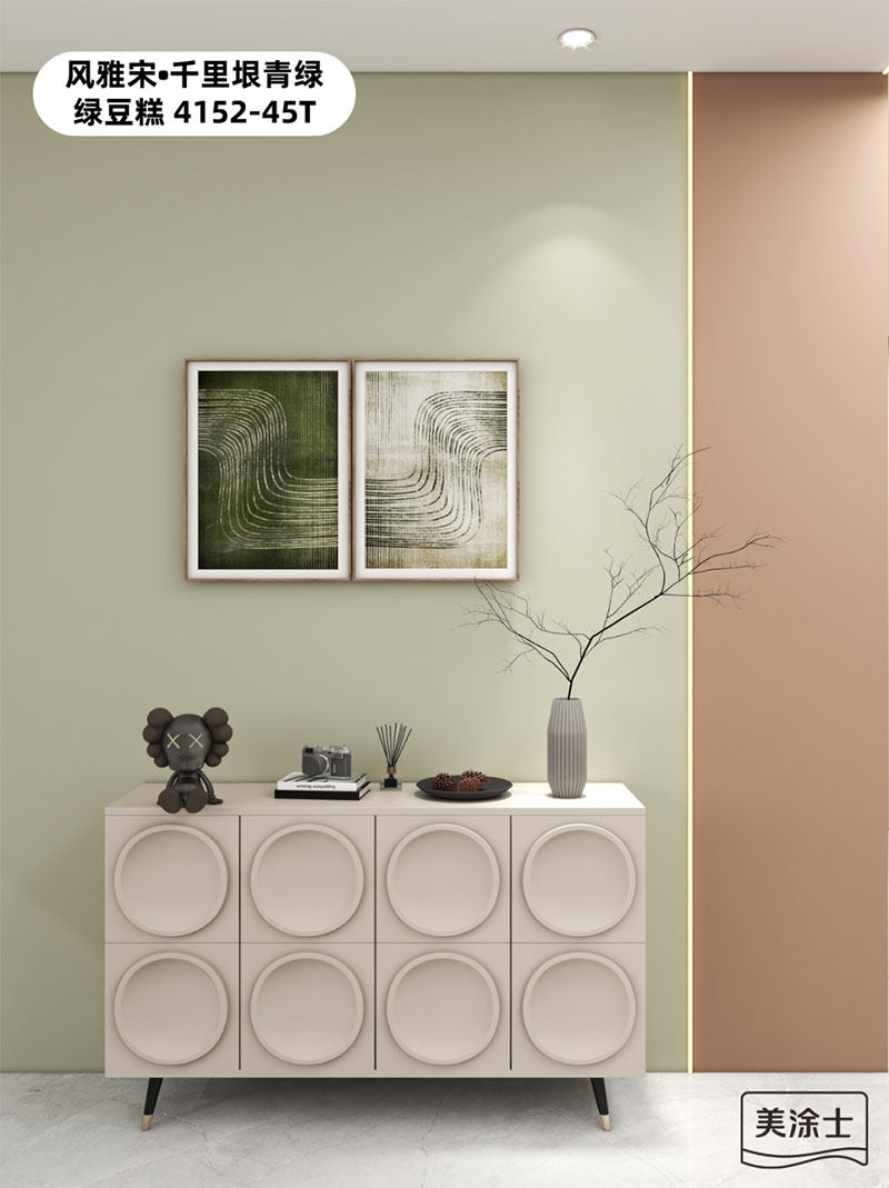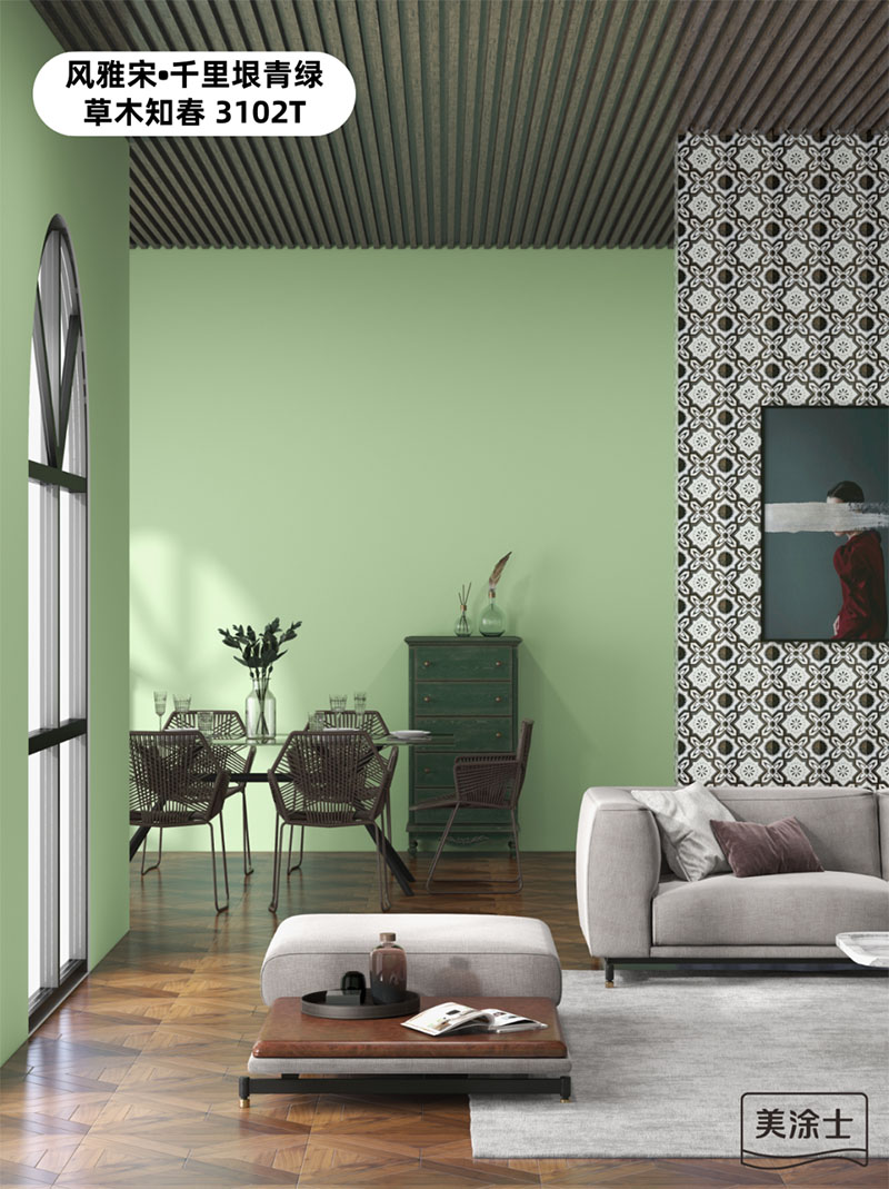 美涂士國潮色草木知春3102T,弱化了復古綠的陳舊感,強化了空間的時髦感,與灰白軟裝的搭配,一明一暗的對比,一冷一暖的融合,奢華的質感與復古的氣息碰撞,勾勒出低調的高級時尚感,讓空間的氣場和顏值達到峰值。