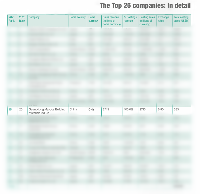 近日,《亞太涂料雜志》發布2021年亞太涂料制造商25強排行榜。該榜單是根據2020年涂料產品收入計算的,反映了2020年亞洲涂料市場情況。榜單顯示,排名前25位的涂料公司2020年累計銷售額為239.5億美元,同比增長2%“,美涂士排名第15位!