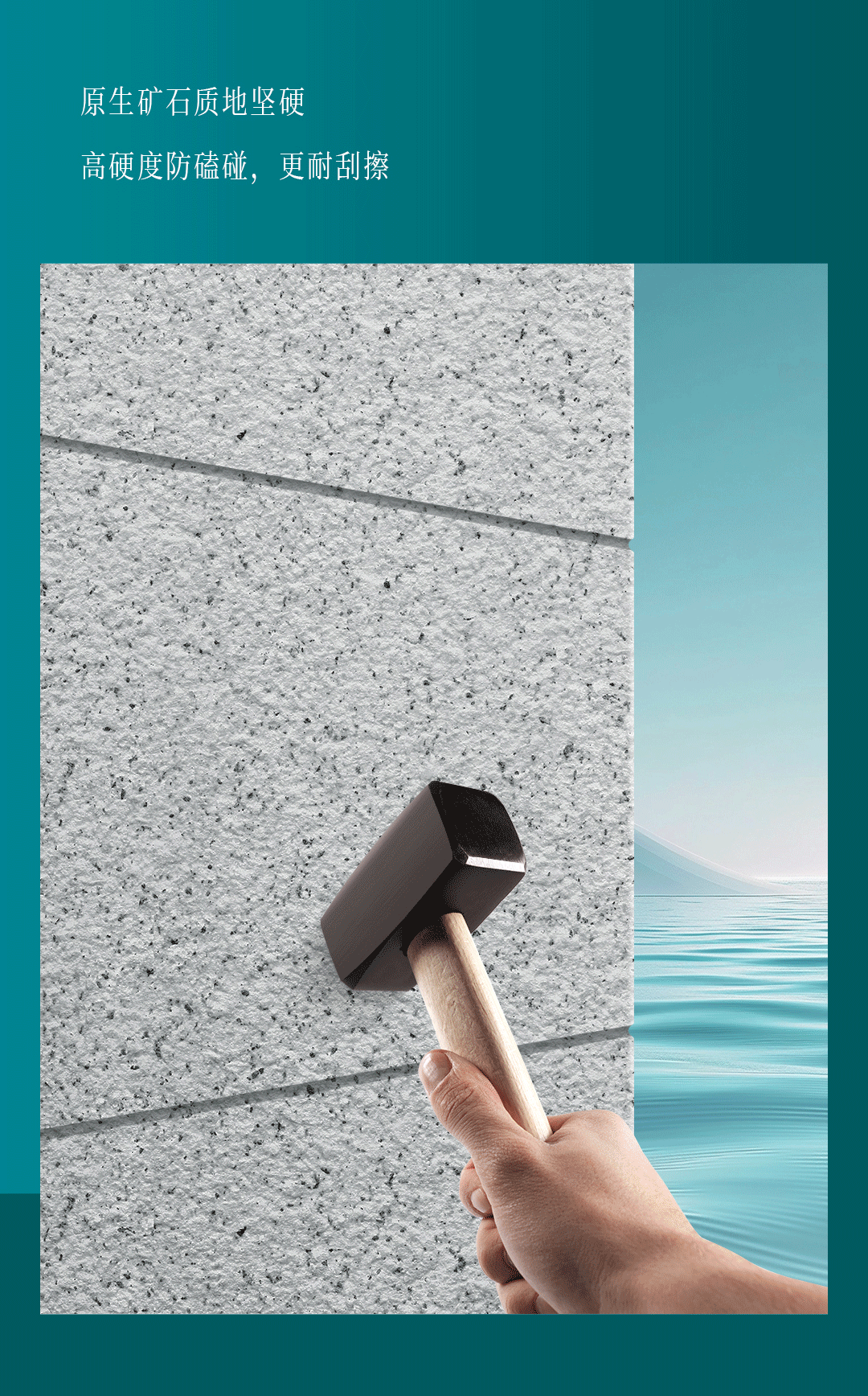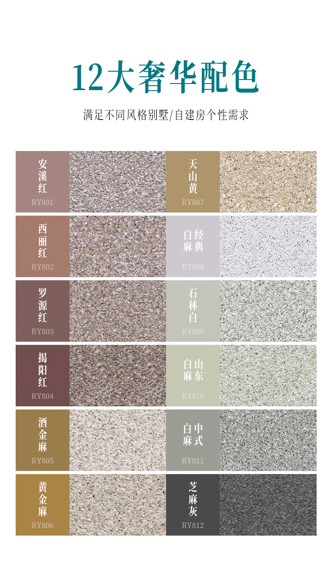 優選具有高耐候、超耐污的硅丙乳液為主要成膜物質,精選顆粒圓潤、質地堅硬的天然彩砂,搭配水性環保型功能助劑精制而成的水性含砂多彩涂料。該產品擁有自清潔、超耐候、高硬度及優異的耐水白等優點,對比普通水包砂多彩,其彩點晶瑩剔透,具有更高的仿石材效果,仿真度高達99以上。榮耀冠晶石是冠晶石體系的升級版,不僅可以得到類似荔枝面或菠蘿面大理石的花紋色彩,同時對墻體有極好的保護和裝飾效果。